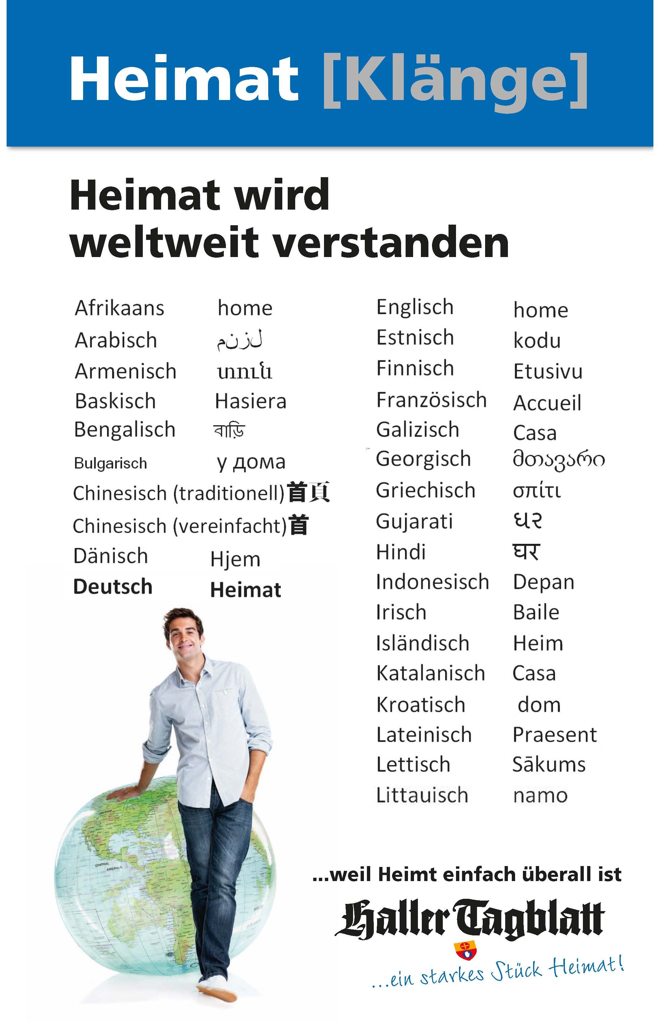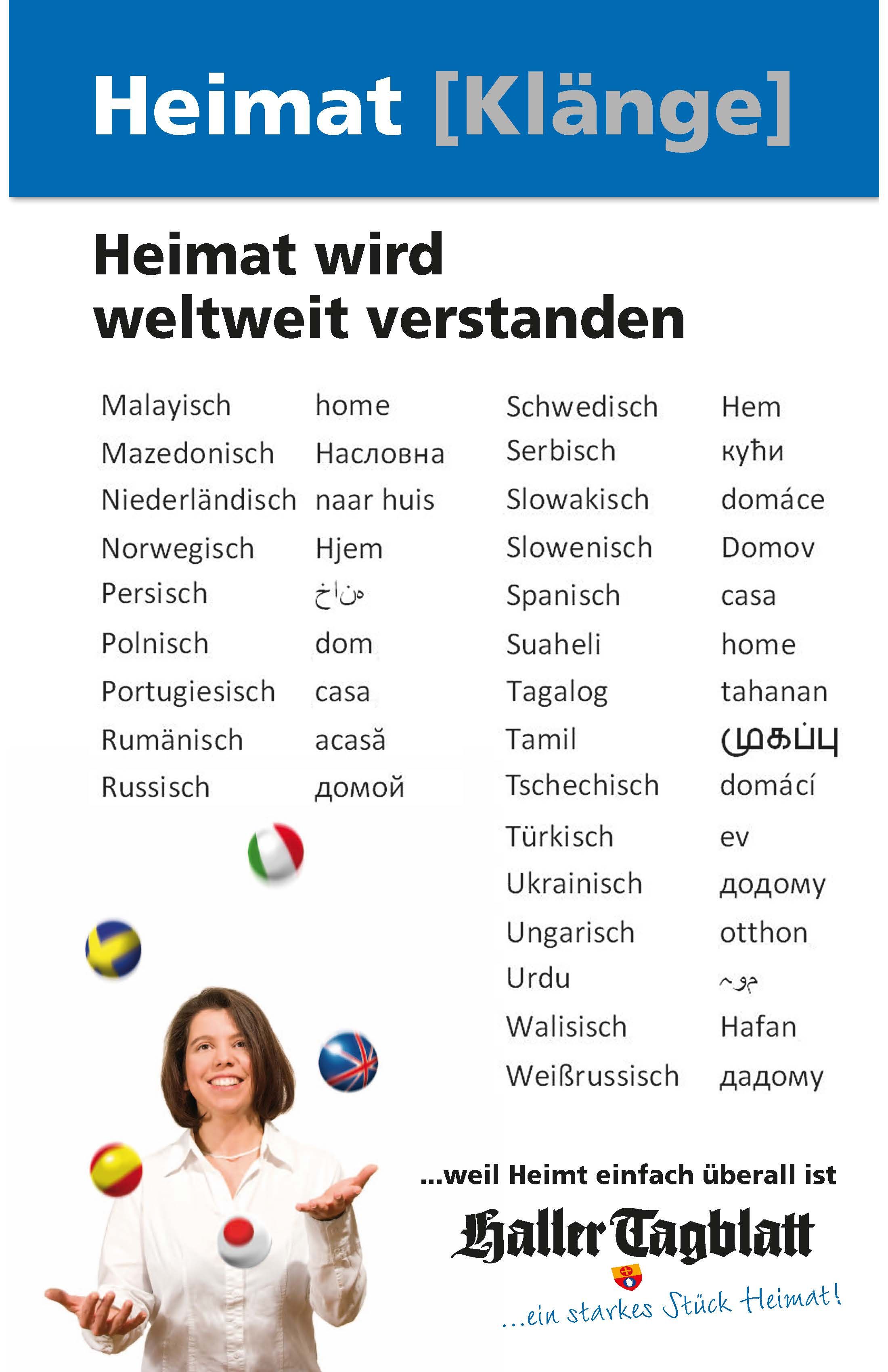 Gegensätze sollten die Heimataussagen vertiefen. Diesmal über die sprachliche Begrifflichkeit um so die Klischees zur Heimatdarstellung zu reduzieren. Auch in der Ferne gibt es Heimat - das zeigen die Fremden Sprachen - und was bringen wir alles mit unserer Heimat in Verbindung. Laufzeit 3 Wochen - Format 1/1 Seite. Grafik: Haller Tagblatt - Gesamtkonzeption, Text und Durchführung: dTbmedi@. Die Sujets können Sie unten anklicken und vergrößern.